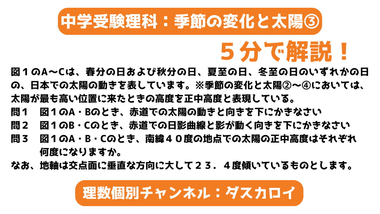 【中学受験理科】【季節の変化と太陽②】図1のA~Cは、春分の日および秋分の日、夏至の日、冬至の日のいずれかの日の、日本での太陽の動きを表しています。これについて、次の問に答えなさい。
