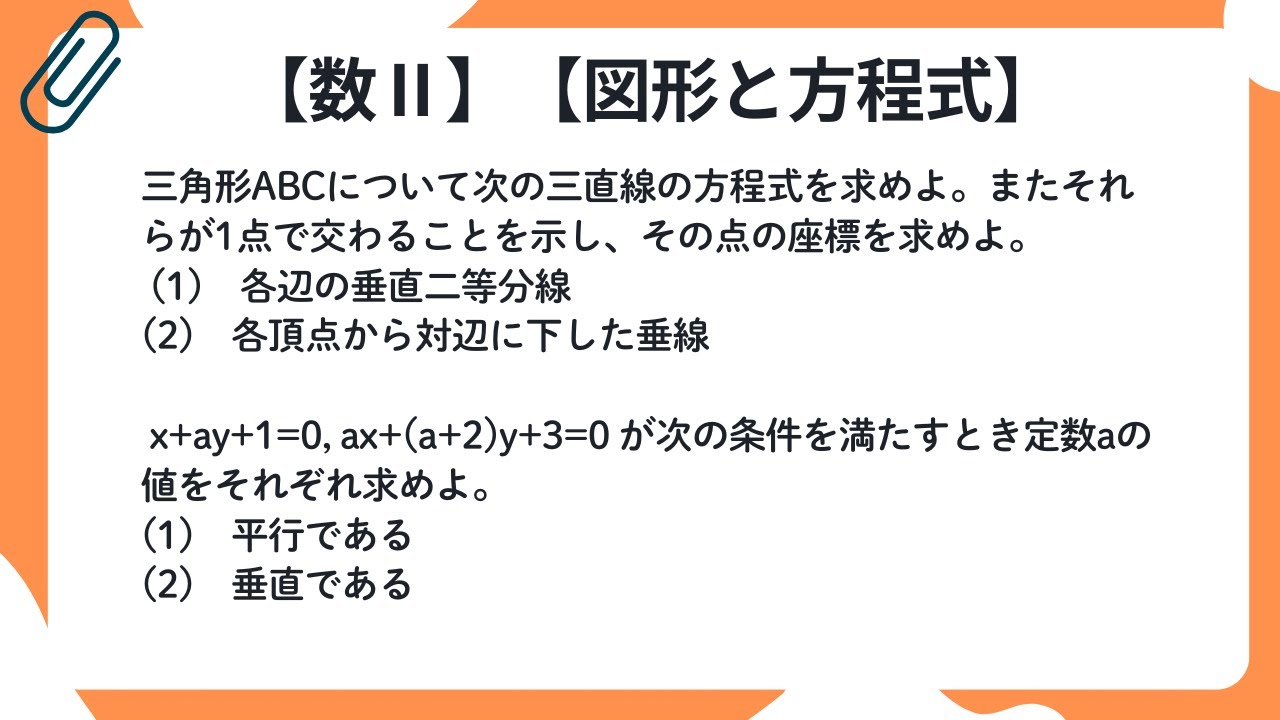 #数A#数Ⅱ#図形の性質#内心・外心・重心とチェバ・メネラウス#図形と方程式#点と直線#円と方程式#軌跡と領域#数学(高校生)