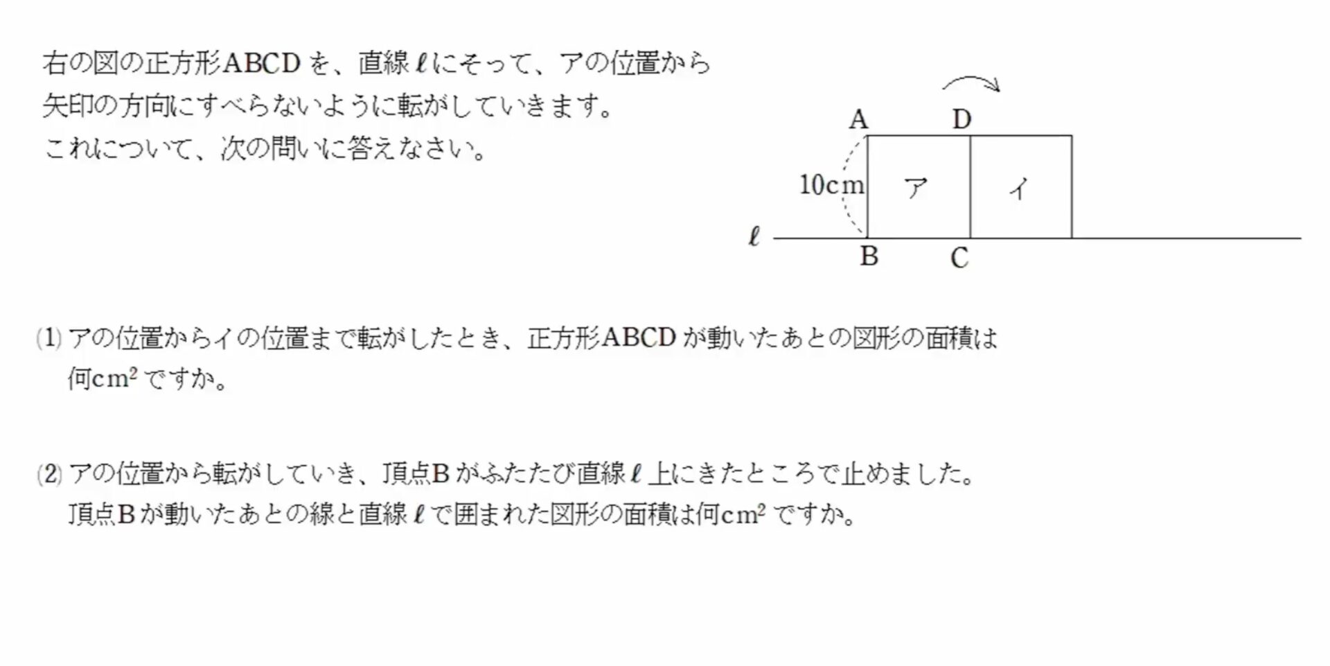 半径2cmの円が、右の図の折れ線ℓにそって、アの位置からイの位置まで転がります。これについて、次の問いに答えなさい。
