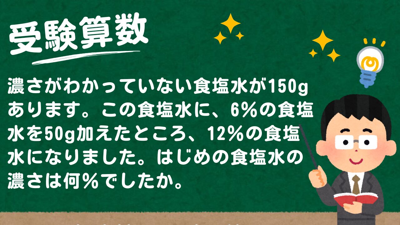 【受験算数】12%の食塩水が150gあります。この食塩水を何gか捨ててから、捨てた食塩水と同じ重さの水を加えたところ、8%の食塩水になりました。捨てた食塩水は何gですか。