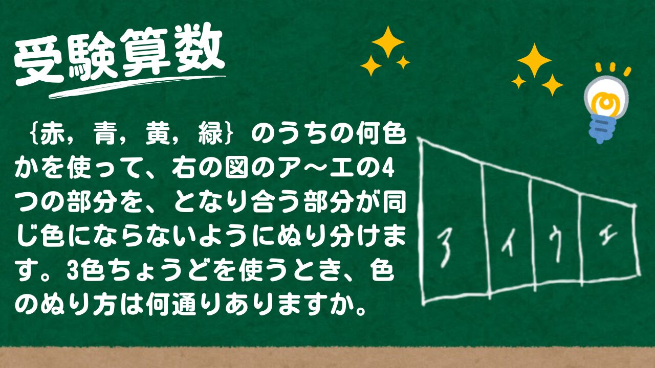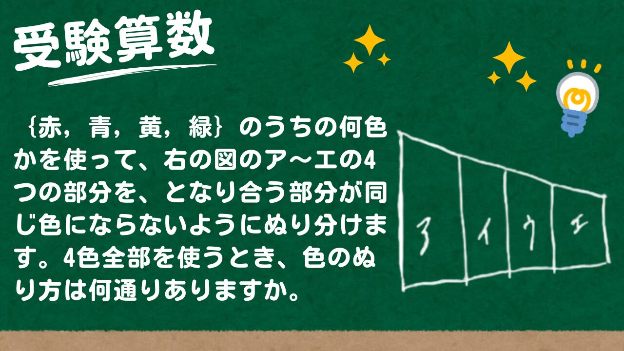 【受験算数】【赤、青、黄、緑、茶】のうちの何色かを使って、右の図のア~オの5つの部分を、となり合う部分が同じ色にならないようにぬり分けます。4色ちょうどを使うとき、色のぬり方は何通りありますか。