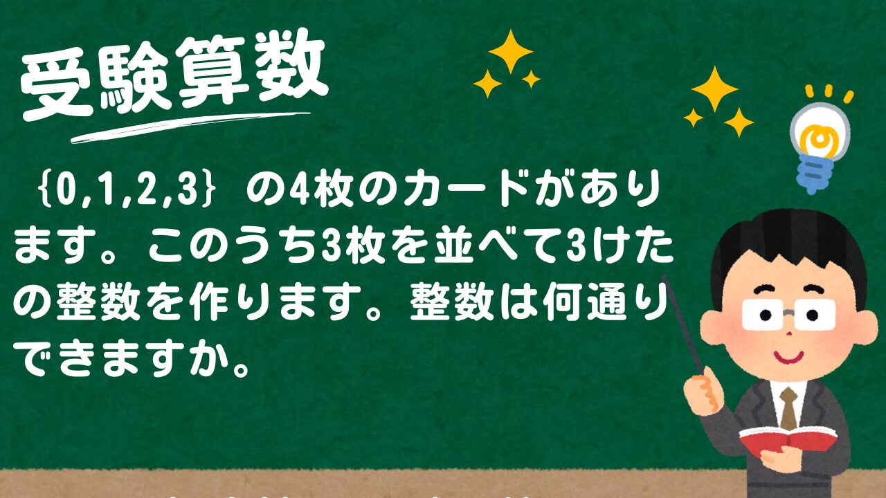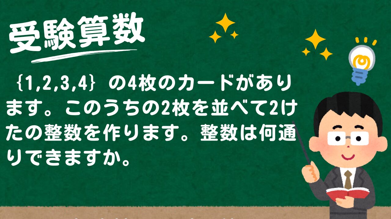 【受験算数】1. 2. 3. 4. 4の5枚のカードがあります。このうちの3枚をならべて3けたの整数を作ります。これについて、次の問いに答えなさい。4を2枚とも使うとき、整数は何通りできますか。