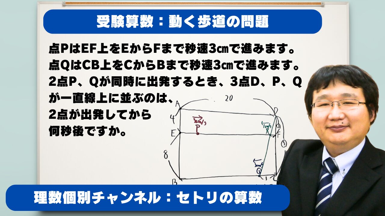 【受験算数】動点移動と相似:点PはEF上をEからFまで秒速3㎝で進みます。点QはCB上をCからBまで秒速3㎝で進みます。2点P、Qが同時に出発するとき、3点D、P、Qが一直線上に並ぶのは、何秒後ですか