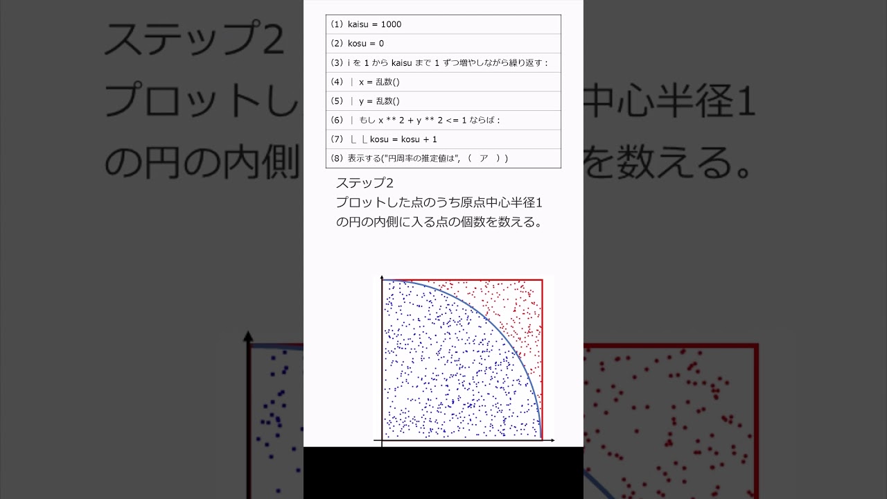 このプログラムはモンテカルロ法を用いて円周率の推定値を求めるものである。 乱数は0以上1未満の実数をランダムに返す関数である。 空欄に入る最も適切なものを選べ。
