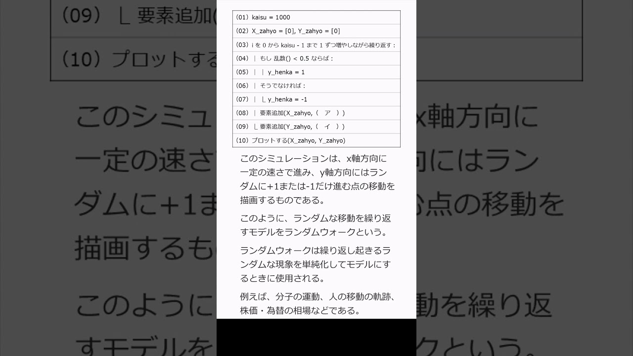 このプログラムはxy平面上を動く点をプロットするものである。 動く点は、各繰り返しごとにx軸方向に0.1、y軸方向に+1または-1だけ動く。 y軸方向に+1動くか-1動くかはランダムである。 乱数は0以上1未満の実数をランダムに返す関数であり、要素追加(配列, 値)は配列の末尾に新しい要素を追加する関数である。 また、プロットする(配列X, 配列Y)は2つの配列の同じ添字の要素を組みとして、xy平面に座標をプロットして表示する関数である。 配列の添字は0から始まるものとする。 空欄に入る最も適切なものを選べ。