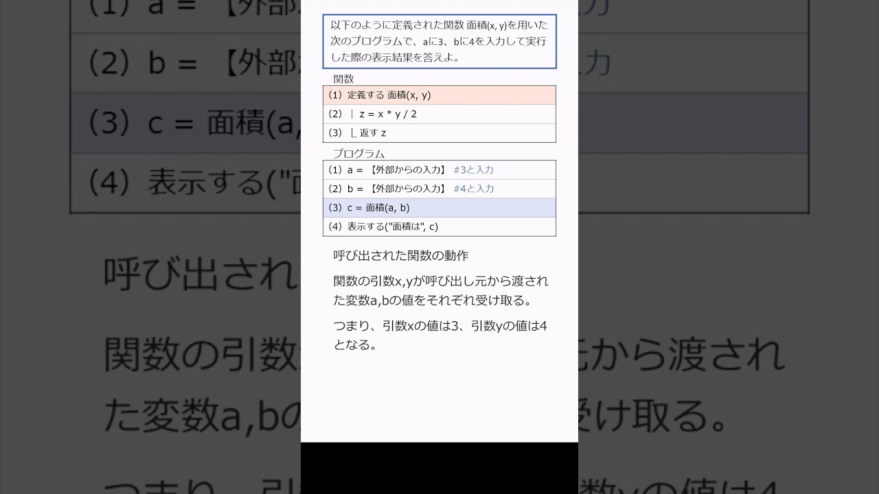 以下のように定義された関数 面積(x, y)を用いた次のプログラムで、aに3、bに4を入力して実行した際の表示結果を答えよ。