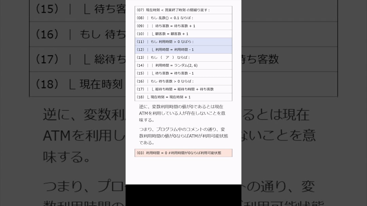 次のプログラムはあるコンビニに設置された1台のATMの平均待ち時間についてのシミュレーションである。