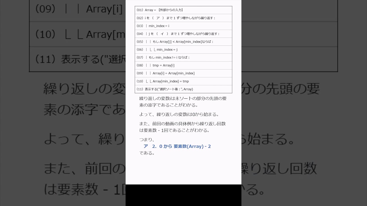 311 2 選択ソートのプログラム:実行回数が最も少なくなるように繰り返しの範囲を定めよう! #shorts