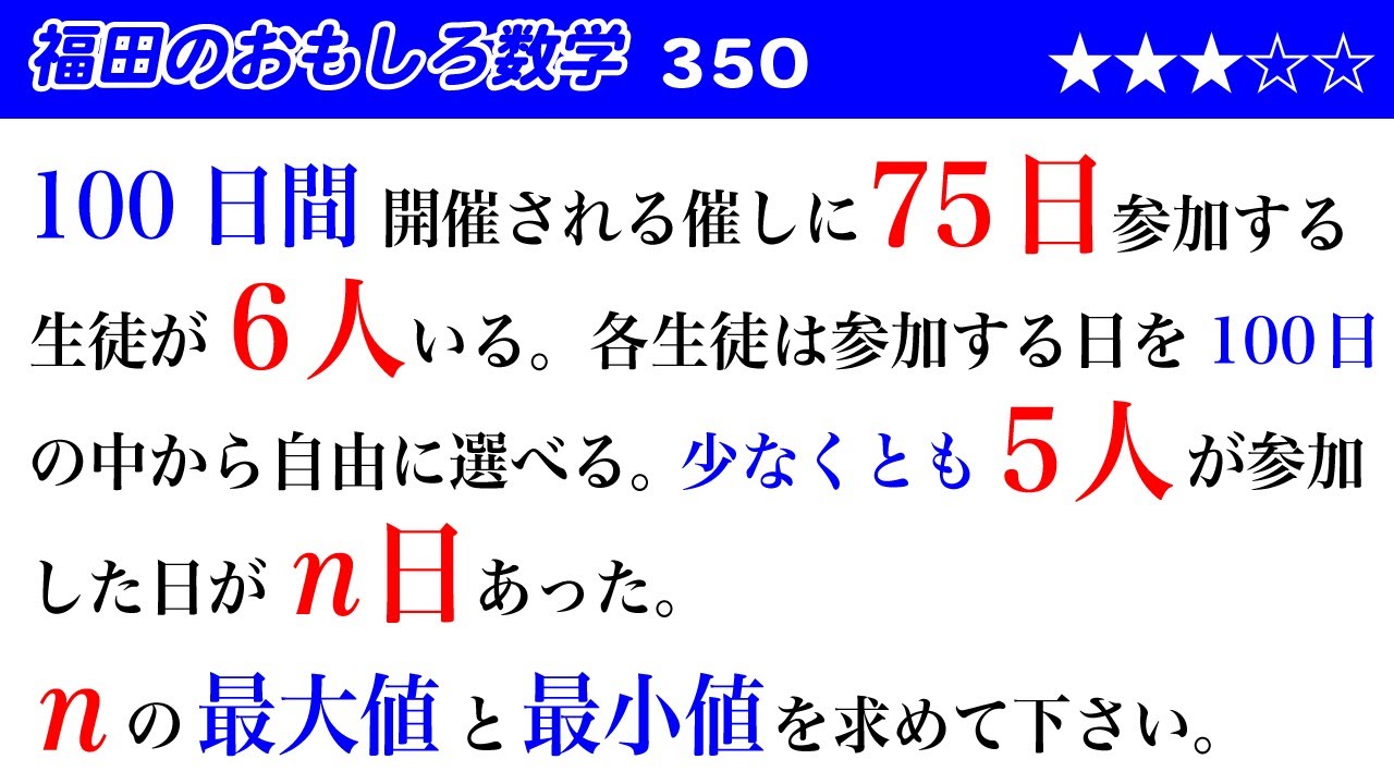 福田のおもしろ数学350〜100日間開催される催しに75日参加する6人の生徒が少なくとも5人以上参加する日数