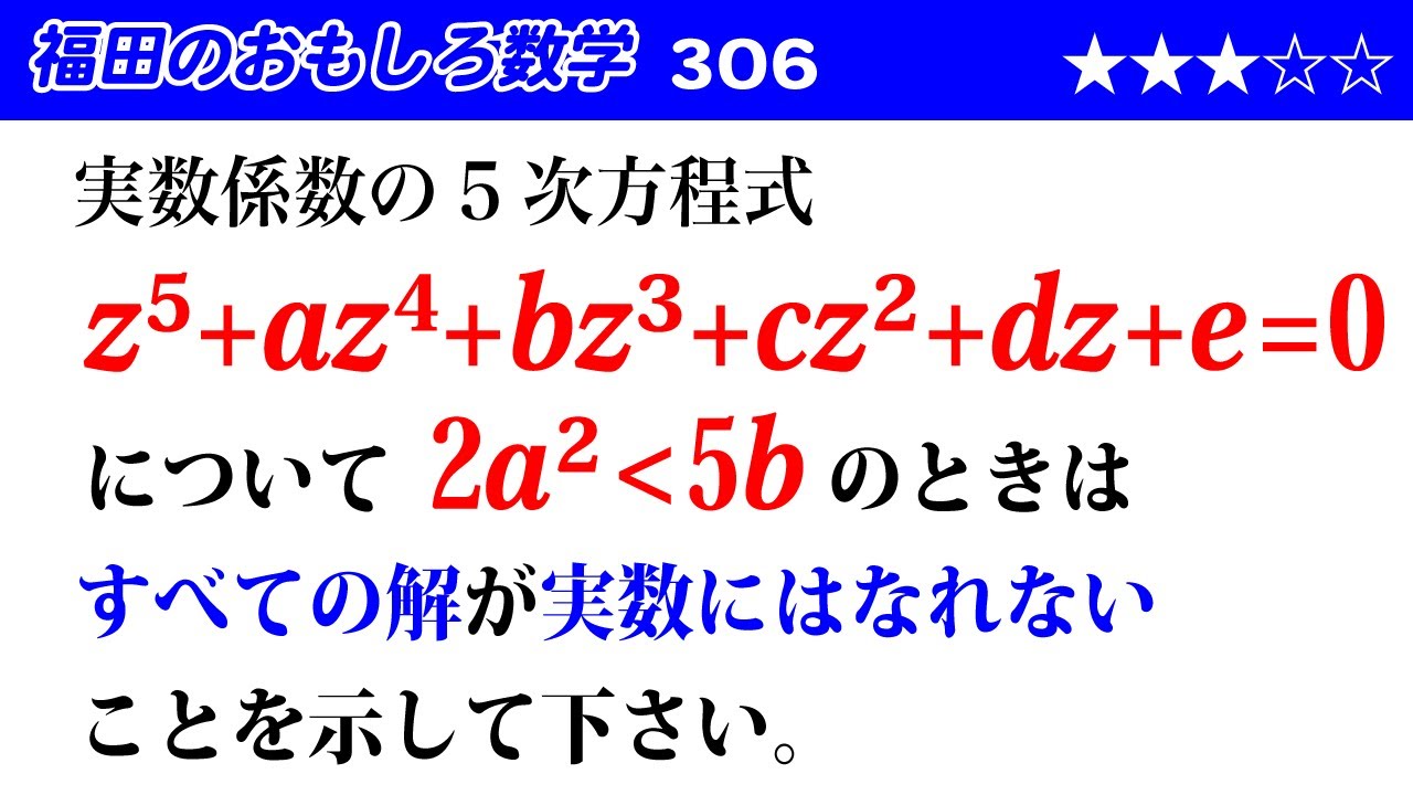 福田のおもしろ数学306〜5次方程式の5つの解がすべて実数にはなれない条件