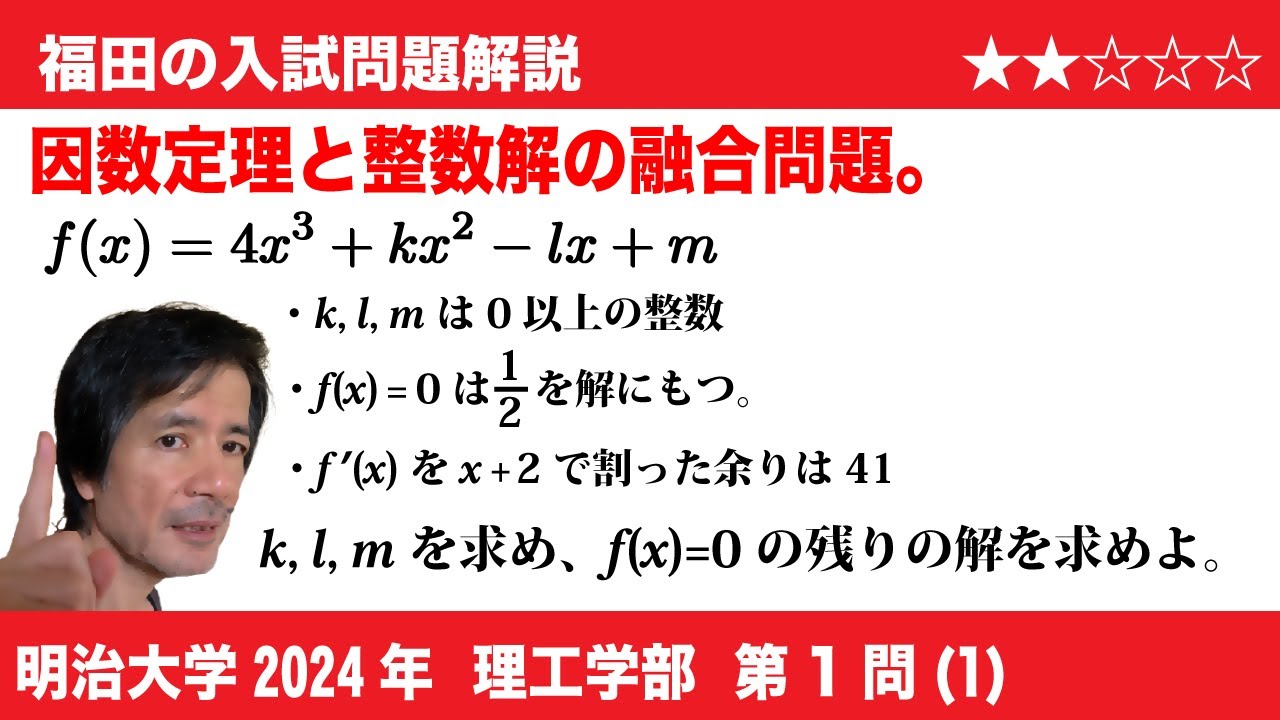 福田の数学〜明治大学2024理工学部第1問(1)〜高次方程式と整数解