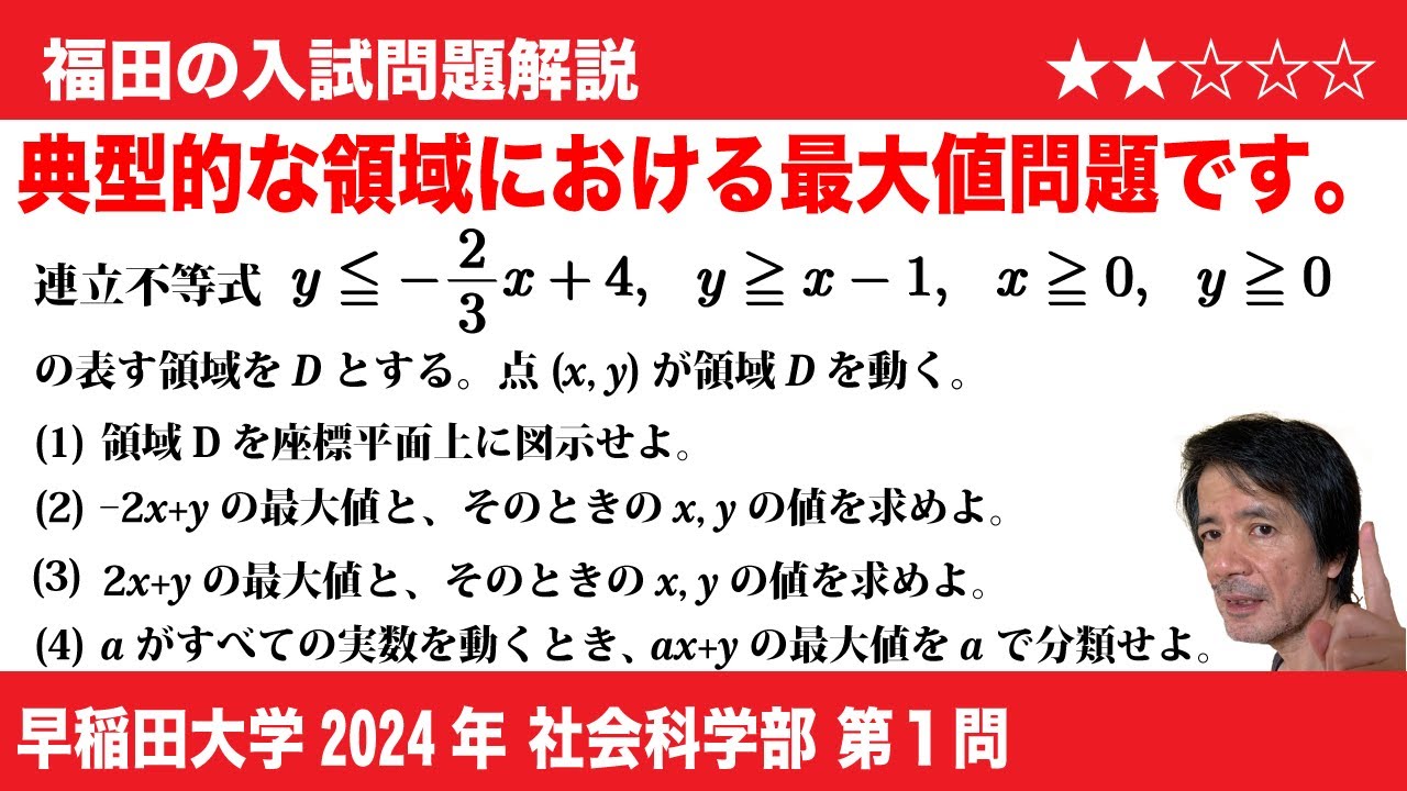 福田の数学〜早稲田大学2024社会科学部第1問〜領域における最大最小
