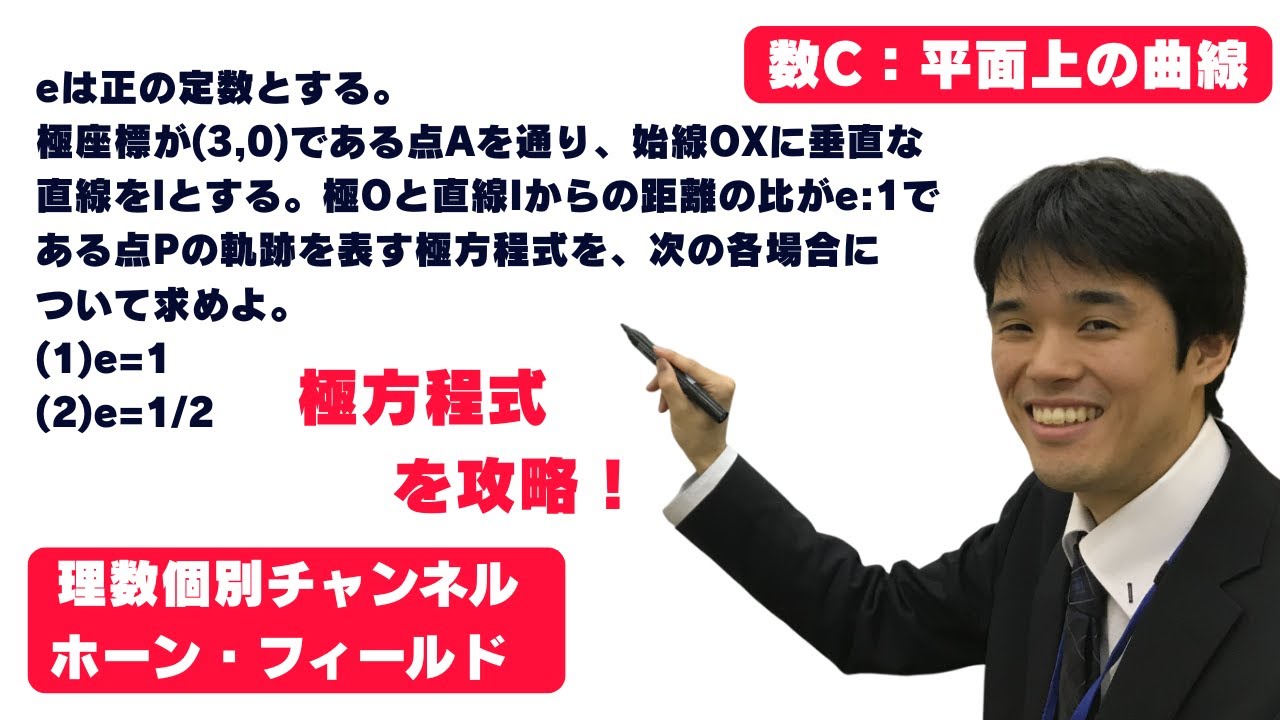 【数C】【平面上の曲線】eは正の定数とする。極座標が(3,0)である点Aを通り、OXに垂直な直線をlとする。極Oと直線lからの比がe:1である点Pの極方程式を求めよ。(1)e=1(2)e=1/2