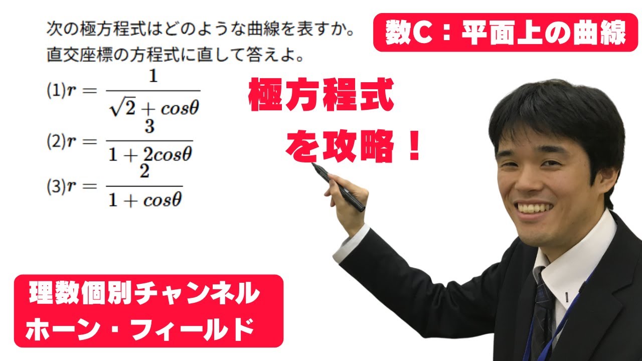 【数C】【平面上の曲線】次の極方程式はどのような曲線を表すか。直交座標の方程式に直して答えよ。(1)r=1/√2+cosθ(2)r=3/1+2cosθ(3)r=2/1+cosθ
