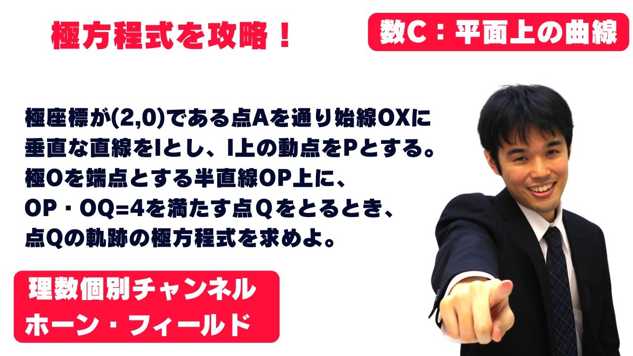 【数C】【平面上の曲線】極座標が(2,0)である点Aを通り始線OXに垂直な直線をlとし、極Oを端点とする半直線OP上に、OP・OQ=4を満たす点Qをとるとき、点Qの軌跡の極方程式を求めよ。