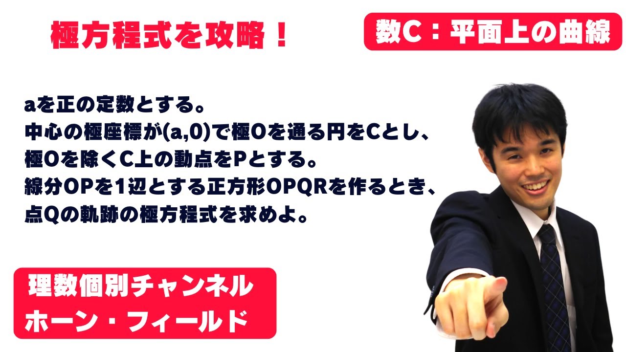 【数C】【平面上の曲線】中心の極座標が(a,0)で極Oを通る円をCとし、極Oを除くC上の動点をPとする。線分OPを1辺とする正方形OPQRを作るとき、点Qの軌跡の極方程式を求めよ。